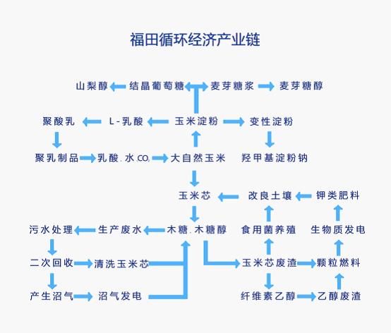 福田科技集團(tuán)“循環(huán)經(jīng)濟(jì)產(chǎn)業(yè)鏈”中的玉米芯產(chǎn)業(yè)鏈,利用玉米芯為原料生產(chǎn)木糖醇,生產(chǎn)木糖醇產(chǎn)生的廢液中提取L—阿拉伯糖,將玉米芯工業(yè)化后產(chǎn)生的污水進(jìn)行處理,產(chǎn)生的沼氣用來發(fā)電;在制造工程中產(chǎn)生的玉米芯廢渣則用于食用菌養(yǎng)殖、食用菌的栽培料。這種將產(chǎn)業(yè)鏈條向前延伸、向后拉長的發(fā)展模式,不僅解決了企業(yè)三廢污染的問題,同時單位能耗顯著降低、產(chǎn)品綜合競爭力顯著提升,創(chuàng)造出巨大經(jīng)濟(jì)效益和積極社會效益。