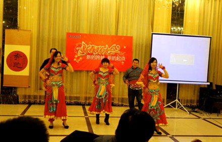 隨后員工們表演了精彩的文藝節(jié)目,歌曲《精忠報國》、《人間第一情》、《永遠是朋友》氣勢豪邁;小品《上司與員工》,引得大家笑聲不斷;舞蹈《美女與野獸》、《HEY MR.BIG》活力無限;另類音樂劇《為愛穿越》新穎精彩。