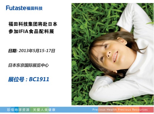 Ifia展是日本最大的食品添加劑和配料及健康食品展覽會,是日本市場最權(quán)威的產(chǎn)品平臺。日本國際食品配料、添加劑及健康食品展覽會(ifia/HFE 2013),將于5月15-17日在日本東京國際展覽中心舉行,屆時我集團(tuán)將赴日參展,展位號為:BC1911,歡迎廣大新老客戶前來參觀指導(dǎo)。