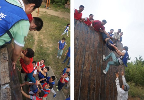 為了進一步強化員工間的相互協(xié)作意識、奉獻精神,本次拓展訓練的重頭戲“畢業(yè)墻”被安排在最后。畢業(yè)墻又稱求生墻,是指團隊在不能借助任何外界工具(包括:衣服、皮帶、繩子等,所能用的資源只有每個人的身體)的情況下,共同努力翻越 4米高的光滑墻面。在培訓師講解完規(guī)則和注意事項后,福田紅藍兩隊迅速合為一體,共同完成此項目。在前面的訓練中,隊員們逐步學會了分工、協(xié)作和奉獻,彼此間已建立了充分的信任。面對四米高墻,許多勇士甘當人梯,讓其他隊友踩著自己的肩膀攀爬,被上面的伙伴拽上墻去。最后一位隊友上去的方法讓人眼界大開:在多人保護下,高墻上一名隊友垂下身體,用胳膊拉住墻下隊友,其他人協(xié)助用力將兩人一同拉上墻來。在成功完成項目后,大家不禁歡呼雀躍。畢業(yè)墻項目的成功完成,是福田團隊集體智慧的展現(xiàn),在過程中整個團隊的凝聚力、合作精神以及隊員間的感情空前高漲,團隊協(xié)作能力大大增強,整個項目完成干凈利落,默契迅速。