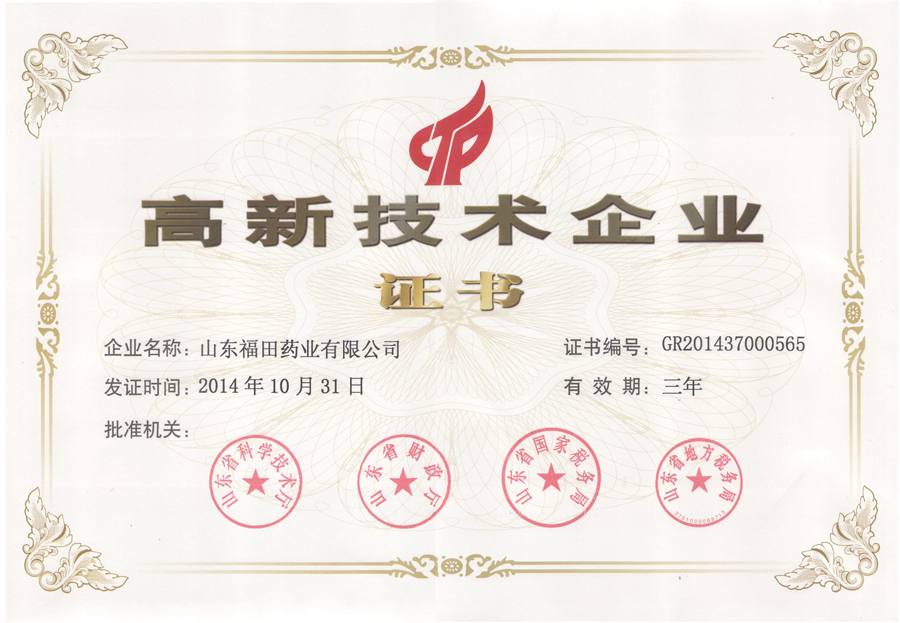 近日,我集團(tuán)旗下山東福田藥業(yè)有限公司獲得了山東省科學(xué)技術(shù)廳、山東省財(cái)政廳、山東省國(guó)家稅務(wù)局、山東省地方稅務(wù)局聯(lián)合頒發(fā)的高新技術(shù)企業(yè)證書。福田藥業(yè)再度被認(rèn)定為國(guó)家高新技術(shù)企業(yè),繼續(xù)享受稅收減免等一系列相關(guān)優(yōu)惠政策。