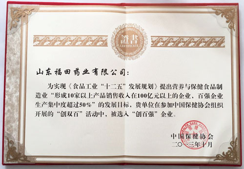 中國(guó)保健協(xié)會(huì)在“十二五”期間組織開(kāi)展了“形成10家以上產(chǎn)品銷售收入在100億元以上的企業(yè),百?gòu)?qiáng)企業(yè)的生產(chǎn)集中度超過(guò)50%”的“創(chuàng)雙百”活動(dòng),四年來(lái)活動(dòng)取得了明顯成效。會(huì)上,中國(guó)保健協(xié)會(huì)為“創(chuàng)雙百”企業(yè)頒發(fā)了獎(jiǎng)杯和證書。我集團(tuán)旗下山東福田藥業(yè)有限公司入選“創(chuàng)百?gòu)?qiáng)”企業(yè)。
