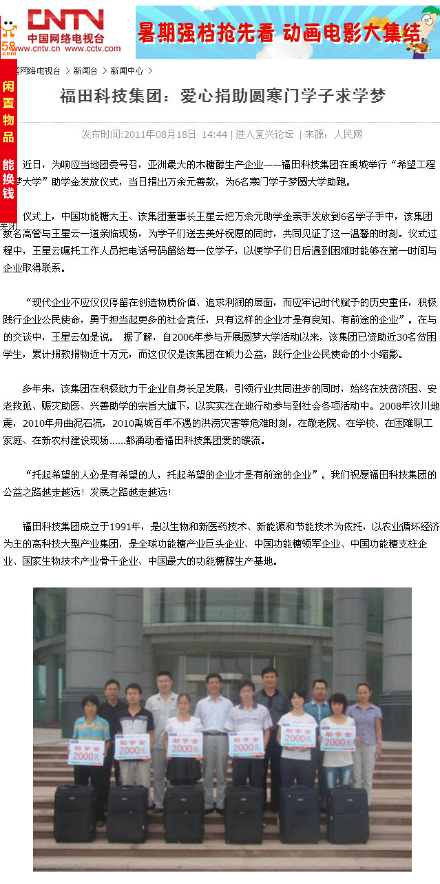 中國網(wǎng)絡(luò)電視:福田科技集團愛心捐助圓寒門學子求學夢