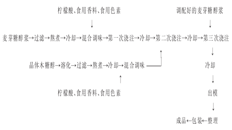 為了解決傳統(tǒng)糖果帶來(lái)的齲齒問(wèn)題,山東福田科技集團(tuán)研制出了以木糖醇、麥芽糖醇為原料,采用澆注工藝生產(chǎn)的新型無(wú)糖糖果。其工藝流程如下: