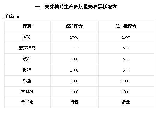 麥芽糖醇在體內(nèi)幾乎不分解,所以可用做糖尿病人、肥胖病人的食品原料?,F(xiàn)例舉低熱量奶油蛋糕配方如表一。