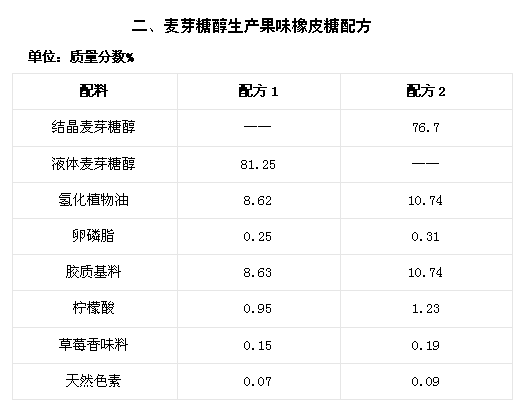 由于麥芽糖醇的風(fēng)味口感好,具有良好的保濕性和非結(jié)晶性,可用來制造各種糖果,包括發(fā)泡的棉花糖、硬糖、透明軟糖等?,F(xiàn)例舉麥芽糖醇制造糖果配方如表二。